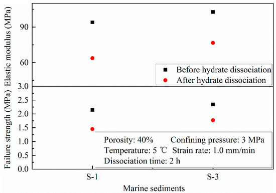 The data in Figure 13 clearly show that the elastic modulus and failure strength of remolded HBMS formed by S-1 and S-3 marine sediments decline significantly after hydrate dissociation, indicating that hydrate dissociation has a significant influence on the mechanical stability of hydrate reservoirs in the natural gas exploitation process. One reason for this behavior could be that hydrate particles of the pore-filling type or the frame-supporting type in HBMS mostly play a partial load-bearing role in the structure strength of HBMS. Thus, hydrate dissociation would also reduce the structure strength of HBMS due to the hydrate particles having vanished. Moreover, by comparing the data on HBMS formed by S-1 and S-3 marine sediments before and after hydrate dissociation in this figure, it can also be found that the value of the elastic modulus and failure strength decline of remolded HBMS in the same layer are almost consistent after hydrate dissociation. This result may imply that the existence of hydrate works in a similar way on hydrate reservoirs in the same layer.