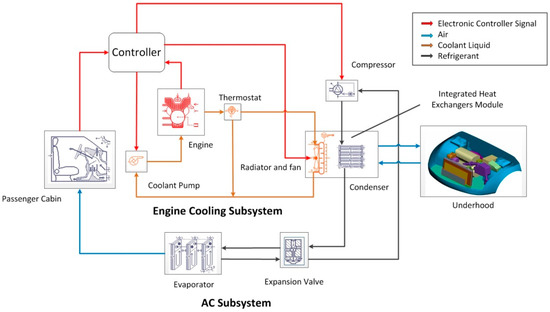 The schematic diagram of the integrated vehicle thermal management control system is shown in Figure 1, including the engine cooling system, air conditioning system, passenger cabin, underhood, and vehicle ECU controller. In engineering developments and integrated vehicle thermal management system designs, there exist three key technical problems as follows:
