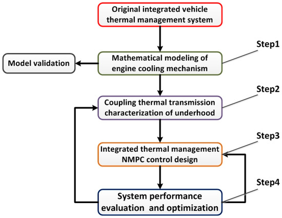 To solve the above technical problems, an optimization control method of integrated vehicle thermal management system based on NMPC was proposed in this paper. This technical route adopted in paper is shown in Figure 2, including four contents of engine cooling mechanism modeling, underhood coupling thermal transfer characteristics characterization, NMPC integrated thermal management controller design, and evaluation and optimization of system thermal control performance.