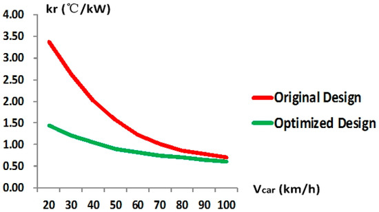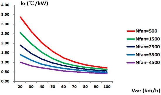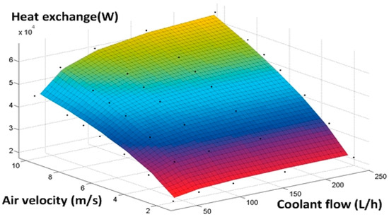 where is the structural heat transfer function, is established with the CFD model, and represents the mathematical relationship between the intake temperature of the radiator and factors. In addition, is the air mass flow rate of the radiator and is related to the vehicle and fan speeds. The thermal transmission equation of the radiator was established according to Formula (10) and is expressed as