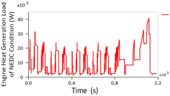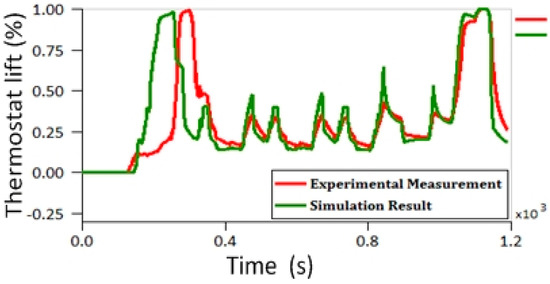 Because the reliability of numerical model directly affects the control performance of thermal management system, the mechanism model of engine cooling established in this paper should be verified the bench test, which is mainly used to provide reasonable system state prediction for NMPC controller. Taking NEDC driving cycle as the test condition, the engine cooling system model was verified by bench test. The vehicle speed information and the gearbox shift strategy in test condition were converted into engine speed signal, which was transmitted to the electromagnetic dynamometer. The dynamometer provided load for the engine according to the controlled engine speed information. The ECU controller adjusted accelerator pedal signal to ensure corresponding engine torque load. The signals of engine speed and brake mean effective pressure (BMEP) were obtained from dynamometer. The heat emission coefficient was determined with the interpolation of engine speed and BMEP in engine MAPs. Finally, the thermal load of the cooling system can be estimated by Formula (1), in which the dynamic fuel consumption rate was measured with fuel consumption meter. Engine speed, fuel consumption rate and BMEP in test condition were present in Figure 7, and the calculated thermal load of the cooling system was shown in Figure 8. Temperature sensors were arranged at the inlet and outlet of the engine jacket and the inlet of the thermostat, respectively reading the coolant temperature inside the engine and the thermostat. The coolant temperature signal could be translated into the information of the valve lift by the thermostat characteristic curve. The radiator was located in a wind tunnel where the velocity was maintained in range of 4.5 ± 0.5 m/s and temperature was controlled within 30 ± 0.2 °C. When the engine coolant temperature reached up to 90 °C, the operating mode was turned on and the fan rotate speed was 4000 rpm. If the coolant temperature was below 80 °C, the mode would switch to stationary. The coolant pump was driven by engine crankshaft through pulley, and the transmission ratio was 1.05. The engine coolant temperature and thermostat lift comparisons between the model calculation and experimental test are presented in Figure 9 and Figure 10, respectively.