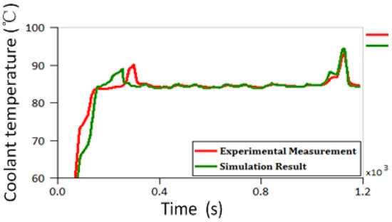 - At the engine starting stage, the thermostat was closed and some coolant remains idle in the radiator cycle but not in the bypass cycle. As a result, the coolant mass determined by the simulation calculation was higher than the actual test value, thereby resulting in a reduced heating rate.