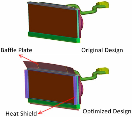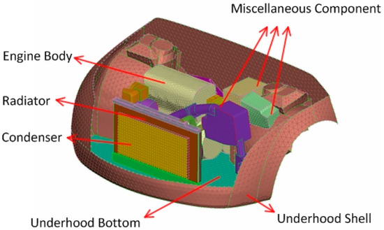 The CFD simulation was applied to observe the flow field, temperature distribution, and heat transfer process in the engine compartment based on the interactive thermal transmission mechanism of multiple heat exchangers. The underhood geometric structure model was displayed in Figure 11 which included the cabin shell, condenser, radiator, engine, and other components.
