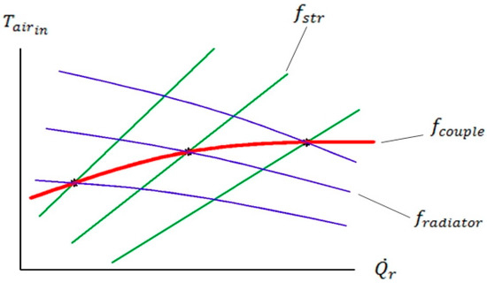 where is the radiator thermal transmission function established by the mathematical model of the cooling system and reflects the relationship between and . In the aerodynamic thermal transmission process of the underhood, and should be both satisfied by Formulas (16) and (17). Under different conditions, and are plotted in the plane coordinate system of and , thereby establishing the simultaneous equation. The construction of a function ensures that all the coordinates of and both satisfy and and are located on the function. The constructor function is defined by the coupling thermal transmission function, and Figure 13 is the schematic diagram of the coupling thermal transmission equation.