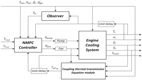 - The NMPC controller of an integrated thermal management system was designed. With determining the controlled parameters, objective function optimization equation and system constraints, the cooperative control of the pump and fan can be realized in the engine cooling process.