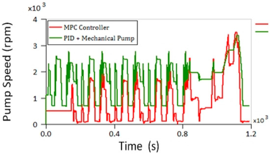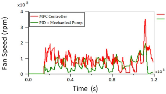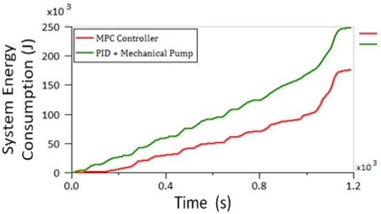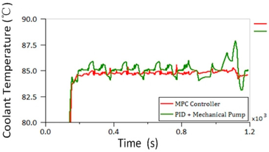 In recent years, the industry has generally accepted the replacement of the traditional cooling mode of engines with electric thermal management technology to significantly improve the temperature stability, dynamic response, energy consumption, and emissions of engines [6]. In these technical solutions, multiple types of controllers have been applied, such as proportional-integral-derivative (PID), robust, and rule-based controllers [7,8]. Khaled designed the controller based on feedback regulation to strengthen the engine cooling capability and concluded that the implementation of a reasonable control strategy is essential to ensuring the outstanding performance of the cooling system [9,10]. Zhou added feed forward control to the engine thermal management control process. As compared to the feedback control system, the feed forward scheme can select lower instantaneous power for the fan, coolant pump, and oil pump while satisfying the engine thermal dissipation requirements, thereby saving 57% of driving accessories consumption [11]. Given the presence of many technological problems in thermal systems, such as multi-input and multi-output (MIMO), high non-linearity, and conflicting control targets, the use of a single feedback controller to achieve the best results is more difficult [12,13]. Model predictive control is capable of system state predictions and control model optimizations to effectively solve multi-objective nonlinear system control problems [14]. The high reliability mathematical model predicts the future system status, the objective function determines the controlled parameters, and the optimal output sequence obtains the control horizon with respect to the state update and the repeated optimization equation solution [15,16]. Mohammad generated a model predictive control scheme for the thermal management of heavy trucks [17]. The comprehensive energy consumption of the system can be reduced by 38% through the implementation of reasonable coordination in the energy distribution of each component and the braking recovery. Lopez designed a double-loop thermal management system for hybrid vehicles [18]. The test results showed that the nonlinear model predictive control (NMPC) thermal management system was improved in terms of the battery warming rate, optimal temperature duration, and energy consumption reduction of the internal resistance as compared to using the non-predictive control scheme.