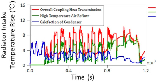 In the cabin, the integrated heat exchangers module was located at the front of engine compartment and was situated in a narrow heat transfer space with other components. During the aerodynamic cooling process, heat exchangers interacted with each other through air flow through two main aspects: (1) an upstream heat exchanger that warmed the downstream heat exchanger air intake; (2) and through fan suction, radiator resistance, and engine obstruction, which generated high-temperature air reflow. The coupling thermal transmission equation was established for the whole engine compartment to determine the mathematical relation of the radiator inlet temperature about the thermal source load and underhood construction. The temperature distribution in the cabin mainly depended on the air flow field and thermal load of the heat sources. The vehicle speed and fan speed were the primary factors for the flow field. In addition, underhood heat sources were also observed such as the radiator load , condenser load , convective heat transfer of engine block , and radiation heat transfer of external environment .