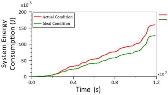 The energy consumption of the pump and fan was calculated by the effective power and efficiency of the fluid machinery. The effective power refers to the mechanical power of the medium obtained from the fluid machinery, which is related to the flow rate and hydraulic head. Efficiency is converted between the effective power and the energy consumption of components, wherein factors such as the fluid friction, bearing rotational friction, and motor mechanical efficiency are taken into account [37].