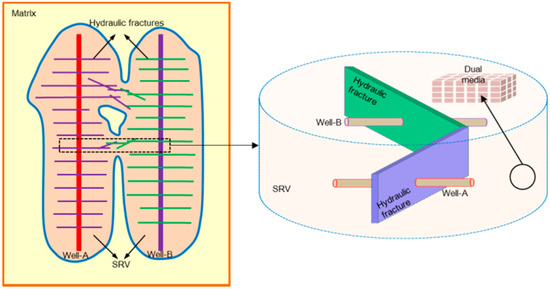Due to the significant difference in porosity and permeability between the fracturing and un-fracturing areas in the reservoir, shale reservoirs around MFHWs are divided into sub-regions, including hydraulic fractures, SRV with abundant inducing micro-fractures, and matrix as shown in Figure 1. Among them, only SRV region is simplified as dual medium due to micro-fracture development; matrix region is single-porosity single-permeability medium, hydraulic fracture is a high permeability medium. Assumptions: (1) Water flow is ignored, and there is only single-phase gas flow existed in each sub-region. (2) Just viscous flow exists in the HF and satisfies the Darcy law [26], neglecting the longitudinal flow. (3) SRV is treated as dual media, and each hydraulic segment’s SRV overlaps with each other in one MFHW. (4) Matrix is regarded as homogeneous ultra-low permeability media. (5) Pseudo pressure function (m) is introduced to simplify the gas composition change with temperature and pressure [27]. (6) There are three connection modes between the well and its neighboring wells, including the connection of the inducing micro-fracture clusters in the SRV and the connection of hydraulic fractures as shown in Figure 1.