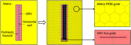 SRV exist around MFHWs in unconventional shale reservoirs, which leads to the flow characteristics of the fluid that are different from those in unstimulated formations. It is necessary to integrate various measurements and surveillance data to build a variable SRV reservoir model. The variable SRV model described here has the following building blocks [28]: (1) Formation evaluation: included all the reservoir characterization data derived from logs and 3D seismic inversions and structural attributes. (2) Surveillance data integration: micro-seismic data are integrated with chemical and radioactive tracer logs. (3) Well performance data integration: Production data is used to determine different flow regimes during the well history and to set bounds for stimulation parameters, such as HF half-length and permeability. (4) Numerical simulation: Micro-seismic attributes (density and magnitude) are converted to a permeability model after being calibrated with tracer logs and production flow regime parameters. pressure, volume, temperature (PVT) data is matched against an Equation of State and input into the model. Due to the abundant micro-fractures induced by hydraulic fracturing in SRV, SRV is regarded as a dual medium containing the matrix and fracture systems.