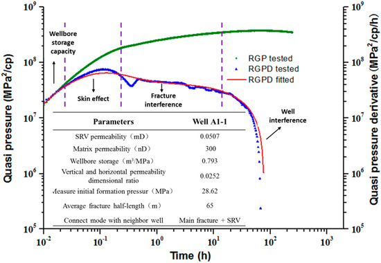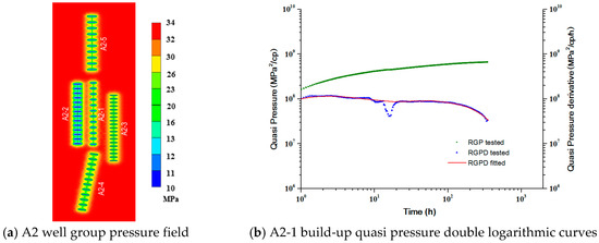 By performing pressure recovery tests on well A2-1 in the center of the well group, inversion of reservoir and fracture property parameters, and analysis of interference from neighboring wells to production. According to the basic parameters of the reservoir, the position relationship of each well, the scale of fracturing construction in each section of the horizontal well, and the tracer test results, a numerical well test model was established to analyze the pressure recovery test data. The simulation results of the simulated pressure field and the pseudo-logarithmic double logarithmic curve are shown in Figure 15. From the simulated pressure field of the numerical well test in Figure 15a, the wells A2-4 and A2-5 arranged opposite to the A2-1 well have weak interference to them. The A2-2 wells arranged in parallel with it and connected to the SRV have strong interference to them, and the A2-3 wells with relatively long distances have weak interference to them. From the plot of the double logarithm curve of the pseudo-pressure in Figure 15b, the lower part of the curve falls, but the amplitude is not large; it shows that there are not many adjacent wells that interfere with it, and there is no multi-segment fracture crack connectivity.