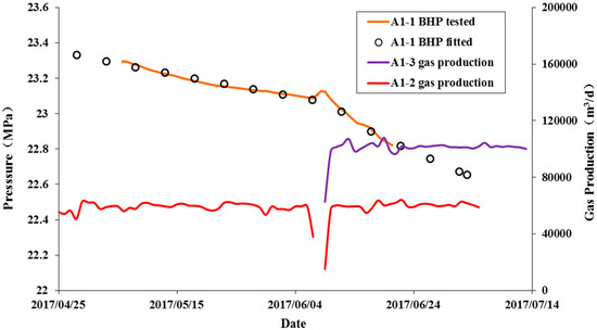 A1-1 bottomhole pressure (BHP) fitting results (A1-3 was a new neighboring well produced at June 2017).