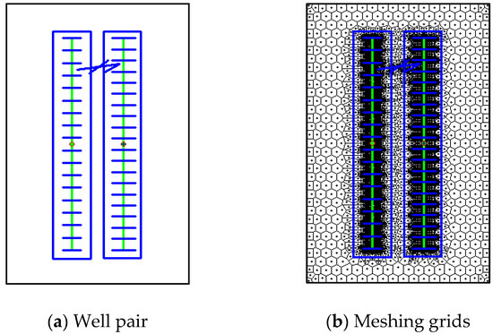 The transient pressure behavior under well interference is influenced by various factors, such as the inter-well communication mode (IWCM), well spacing, number of neighboring wells, and well pattern arrangement [34,35]. The influence of different factors is analyzed by combining the established multi-zone coupled flow model. According to the reservoir and fracture parameters obtained from the well test and laboratory test data of Jiaoshiba shale gas field, it is assumed that the permeability of the matrix is 0.001 mD to 0.003 mD, and the SRV has a permeability of 50 to 200 times that of the matrix. The horizontal well-length is 1500 m. Each well is fractured by 19 sections, and except for connecting HFs, other HFs are of the same length and have the same conductivity; the initial pressure of the reservoir is 34 MPa, the temperature is 96 °C., and the gas component is dominated by methane (98%) with a small amount of nitrogen (0.7%), carbon dioxide (0.6%), ethane (0.4%), and propane (0.3%); the well spacing between the well and neighboring well is 300–600 m. Based on these parameters, a corresponding mechanism model was established. The well pair sketch and meshing grids under the coexistence conditions are shown in Figure 5.