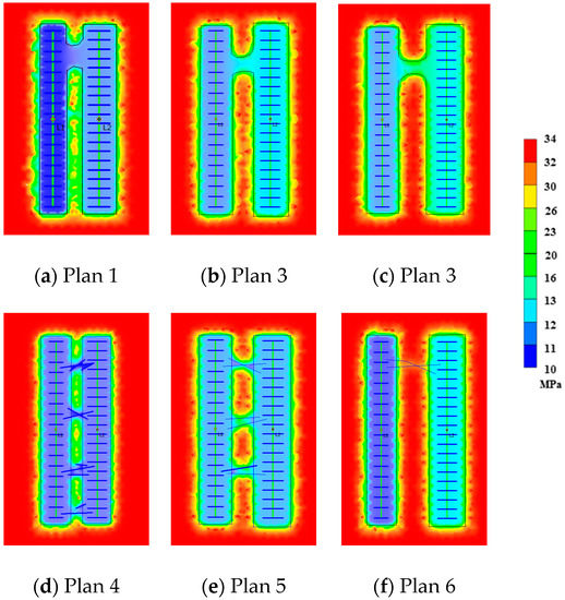 - In Plan 1, Plan 3, and Plan 6, the two wells have poor fracturing effect and the pressure drop near the HFs is significantly larger than that of the surrounding SRV in each plan. It shows that the pressure drop in the control range of a single well is not balanced enough and the development result is not ideal.