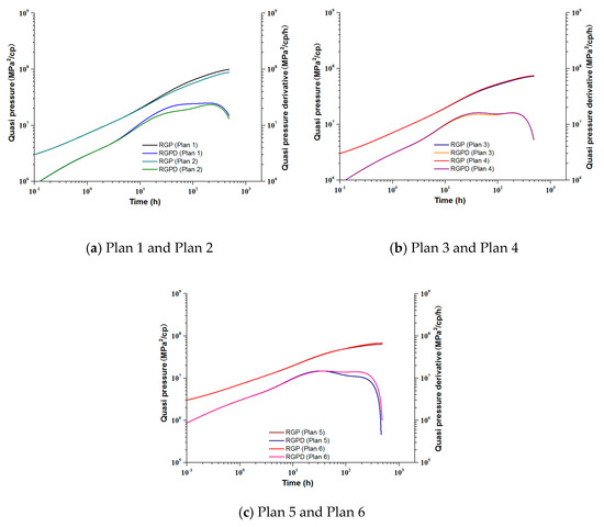 Through analyzing the pressure recovery curve of each plan in Figure 8, we get the following understanding. (1) the interference degree comes from neighboring wells in each plan is compared based on the fall magnitude in the later part of the pseudo pressure derivative curve (PPDC): Plan 2 > Plan 6 > Plan 4 > Plan1 > Plan 5 > Plan 3; (2) When HFs or SRV’s induce micro-fractures is in rich, it first experience a brief stratum-fracture bilinear flow (the slope of the pseudo pressure derivative curve is close to 1/4), and then it converts to formation linear flow (the slope of the pseudo pressure derivative curve is close to 1/4), late-stage well interference causes the pressure curve to drop. When induced micro-cracks are not abundant, they mainly experience formation linear flow, and the characteristics of later well interference are not obvious.