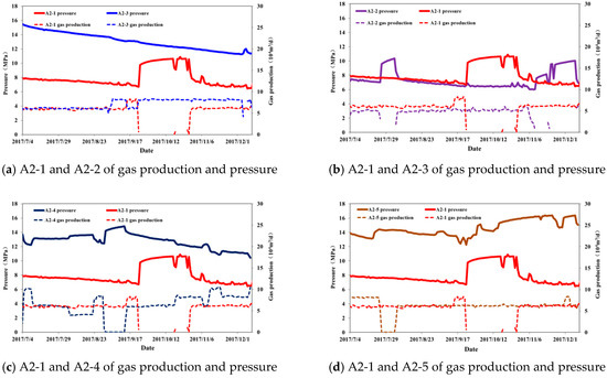 In order to further verify the interference of 4 neighboring wells to the central well A2-1, the gas production and pressure of the adjacent wells during the pressure recovery of this well were compared (Figure 16). During the recovery of pressure in this well, well A2-2 was normally produced but the pressure decreased slowly or even recovered. The rate of decline of the other three wells did not change substantially during this period. It is confirmed that well A2-2 has a significant influence on well A2-1, which is in agreement with the conclusion of numerical well test analysis. In short, the interference between the two wells is relatively small (A2-1 and A2-4, A2-5), but the interference is smaller when the well spacing is larger (A2-1 and A2-3). Although A2-1 and A2-2 wells interfered with the SRV mode, they did not cause serious pressure drop.