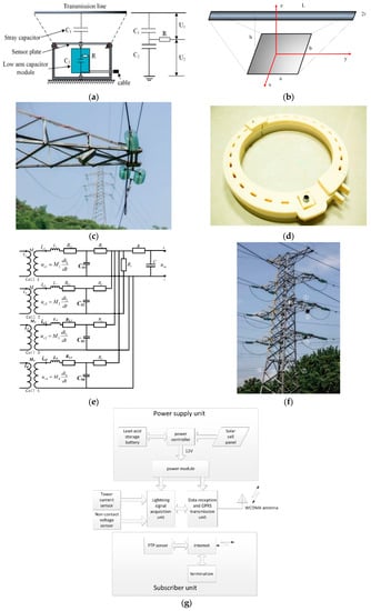 Configuration of the non-contact lighting monitoring system. (a) schematic diagram of the overvoltage sensor; (b) capacitance calculation model; (c) installation of the overvoltage sensor; (d) structure of the tower current sensor; (e) circuit model of the tower current sensor; (f) field installation of the lightning monitoring system; (g) structure of the monitoring system.