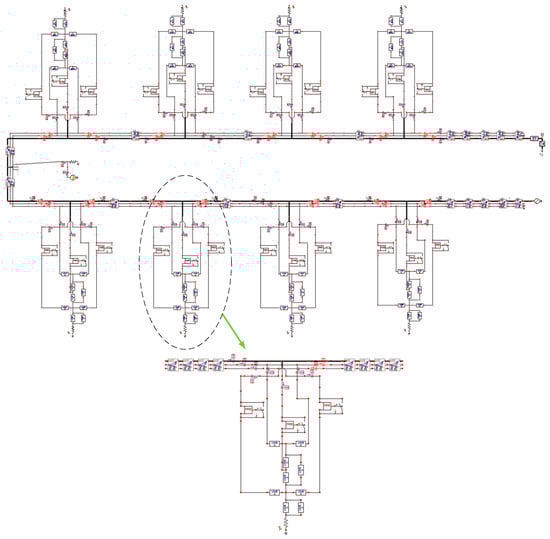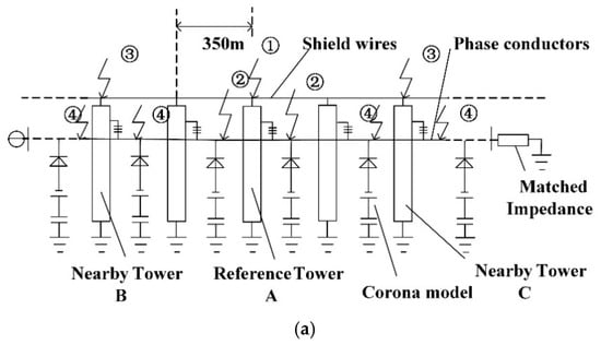 The multi-wave impedance model is constructed to simulate the transmission tower according to the actual size provided by the state grid of China [,]. The impulse grounding resistance is set as 5 Ω or 10 Ω when lightning strokes to a phase conductor and 10 Ω or 20 Ω when lightning strokes to the top of the tower or the shield wire. The J. Marti model is used to simulate the transmission line considering the frequency-dependent characteristic []. The whole line is 10-km long. A total of 30 110 kV towers are erected, 350 m apart from one another. The whole line (LGJ–240) is protected by two shield wires (GJ–50). The corona model is composed of an additional capacitor, a direct current (DC) voltage source, and a unilateral diode according to the literature []. For the positive lightning current, the additional capacitance is 0.65C0, whereas the capacitance is 0.4C0 for negative lightning current, where C0 is the geometric capacitance of the transmission line. The schematic diagram of the EMTP model is shown in Figure 2.