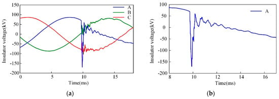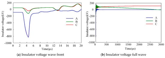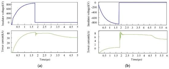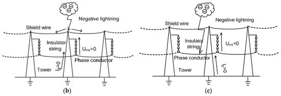 Figure 4a shows the situation before back flashover, Uins > 0. Because in the early stage of the main discharge, lightning current is small, and the positively induced voltage Ui on the phase conductor is greater than the negative coupling voltage kUtower. Utower is the potential of the tower top. The phase conductor potential Uconductor = Ui − kUtower is positive. In addition, the absolute value of the cross arm potential Uarm is significantly higher than that of the phase conductor Uconductor because most of the lightning currents pass through the tower to the ground. Uins = Uconductor − Uarm > 0.