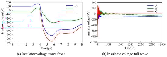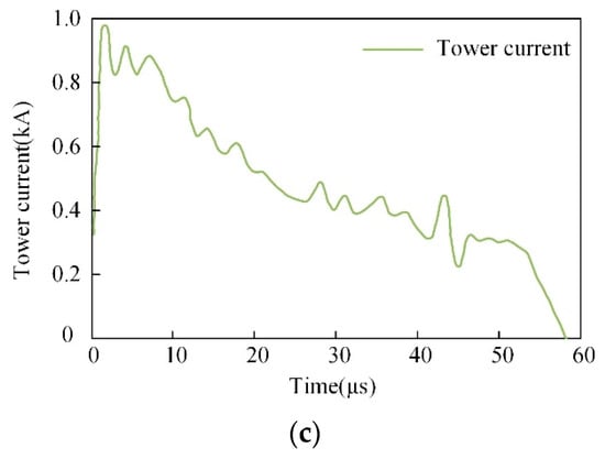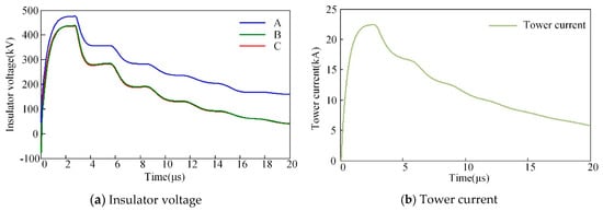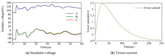 Statistical data show that 75%–90% of lightning discharges are negative []. Thus, negative lightning current is taken as an example for analysis in this study. The peak of the lightning current source is 15 kA or 6 kA for the situations of direct lightning strokes to a phase conductor with or without flashover, and 60 kA or 30 kA for the situations of direct lightning strokes to the top of the tower or the shield wire with or without back flashover. The wave impedance of the lightning channel is 300 Ω []. The insulator uses the leader progression model [], and its ±U50% is 800 kV.
