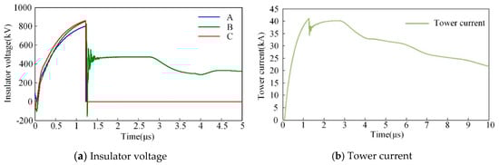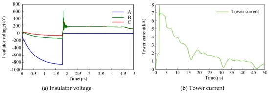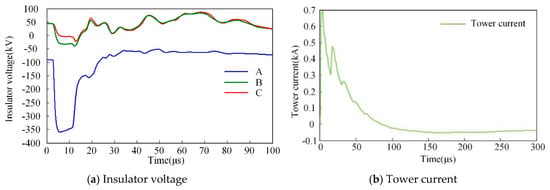 In Figure 8a, lightning strokes to a phase conductor of the reference tower A, and the absolute value of the phase conductor potential Uconductor increases sharply at the striking moment. The coupling current in the shield wire causes a voltage drop when it goes through the tower to the ground; the potential of cross arm Uarm has the same polarity as the lightning current. In general cases, the coupling coefficient between the phase conductor and the shield wire is approximately 0.2, and the coupling current is significantly smaller than the lightning current. In this case, the absolute value of cross arm potential Uarm is significantly smaller than that of phase conductor potential Uconductor, that is, Uins < 0.