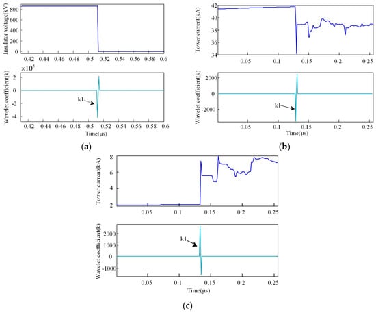 Wavelet transform modulus maxima (WTMM) of insulator voltage and tower current. (a) insulator voltage and its WTMM when insulator flashovers; (b) tower current and its WTMM when lightning strokes to the top of the reference tower with back flashover; (c) tower current and its WTMM when lightning strokes to a phase conductor of the reference tower with flashover.