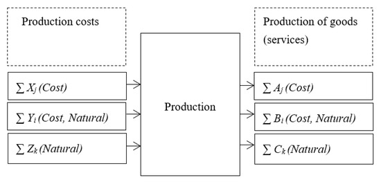 The energy analysis is intended for external users, and therefore, indicators must be standardized. The energy analysis is meant to be an auxiliary indicator for financial analysis. A standardized energy indicator will enable the comparison of energy efficiency among various enterprises. The production activity of any company is reflected in the flow of information that quantitatively reflects activities. All arrays of the considered data can be divided into two main sets [36,37] (Figure 1):