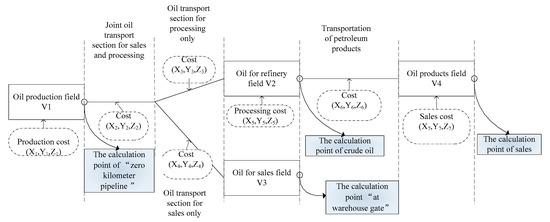 On the basis of financial and administrative statements, financial and economic analyses were conducted. Value terms of expenses and releases were used only to conduct the financial analysis. The economic analysis used both costs and natural values (Figure 2). For energy analysis, it is necessary to calculate the expenses in physical units. According to the authors’ interests, it is important to define the impact of performance on cost efficiency and energy efficiency. For this purpose, the calculation of the compared indicators of the financial and energy analyses must be structurally identical, with the distinction that one calculation is made in cost units, and the other in physical units. However, in the case of the vertically integrated oil and gas company (VIOGC), the financial statement incorporates all production divisions, including production, transportation, and processing. A VIOGC sells raw oil at the stage of extracting oil. At the stage of transporting and processing, oil refineries belong to the company [42]. It is very common that in the first stage, crude oil is also bought from other organizations. Therefore, crude oil and oil products are obtained at different prices in the market. There are differences in production cost, but prime costs consist of all expenses incurred during the reporting period without separating these costs in the financial statement. The revenues and profits are integrally considered on all productions in the same way, and total revenues over all divisions (including prime costs and profits) are part of the financial statement. Therefore, conducting the financial analysis on the basis of total values is possible. However, in conducting energy analysis, the amount of produced oil and the volume of produced oil products have analogous revenues. We can consider the valuation of both oil and oil products as further operations, but we cannot sum the energy equivalents of oil and gas products, and cannot conduct the analysis using this value. When conducting an energy analysis, we should always set the calculation point (sometimes called the boundary), and then operate with the costs and quantities of products under this advising point of the calculation (Figure 3). This process is the main difference between the energy analysis and the financial analysis. If the enterprise is too small, it is engaged only in oil production, and thus, only one point of calculation is available. Therefore, we have an opportunity to conduct a comparison of the dynamics of financial performance and their energy analogs. In a case with a VIOGC, for the comparison of dynamics of financial and energy performance, it is necessary to lead to a given calculation point [24].