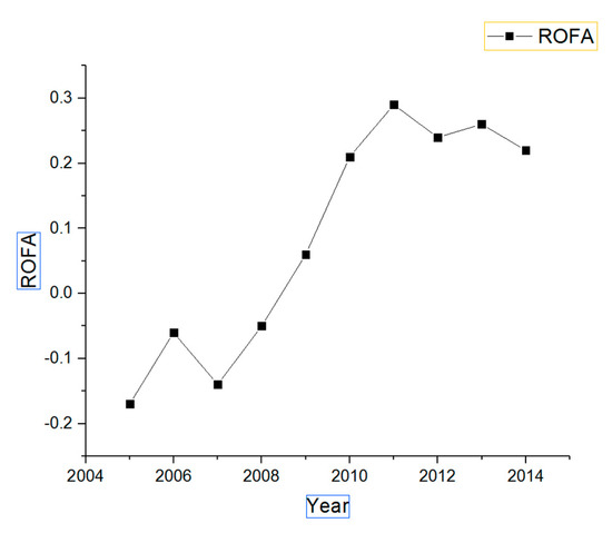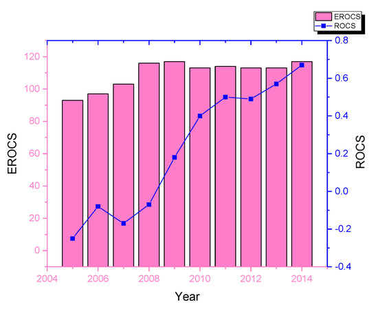 We used the conversion rates listed in Appendix B to calculate indicators. The values of ROCS and EROCS are shown in Appendix C and Figure 4. To calculate EROFA, the total quantity of equipment and machinery were taken into account, and the resulting values were converted into energy units. Then, calculations were made with the depreciation and without depreciation. The depreciation of fixed assets according to the 2014 financial report was 14.6%. As shown in Figure 4, the rate of ROCS in the period from 2005 to 2008 was negative due to negative net profits. The company was profitable from 2009 to 2014, and the value of the ROCS was from 50% to 70% from 2013 to 2014. Furthermore, the EROCS had very high values from 90 to 120 throughout the analyzed period. Specifically, the growth of the EROCS values was at levels above 100. If EROCS values are at low value level (below 5), it may be necessary to assess the appropriateness of the use of this type of energy and transition to another. The growth levels of EROCS values were from below 100 to above 110 during the period 2006 to 2009. Values of the ROFA indicator depend on the size of net profits, which were negative in the period from 2005 to 2008. With increases in net profits, the values were established at the level of 20 to 30%.