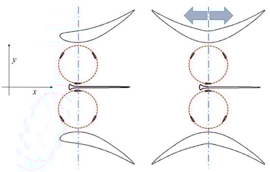 As mentioned, this study took inspiration from the HARVEST hydrokinetic device [30,31]. Starting from the original concept and keeping the same geometry for the turbine, the diffuser and the separation wall between the two rotors described in [30], we also considered a second flow concentration system characterised by a new symmetrical diffuser that is simply obtained through a mirror copy of the divergent part of the original diffuser. Thanks to the symmetry the new diffuser can operate with the same performance on both ebb and flow tides. The original and the new bi-directional systems are shown in Figure 1, that illustrates the top view of the turbine system on a cut-plane normal to the turbine axes (the water is supposed flowing aligned with x-direction and coming from left). More geometrical details can be found in [30], pp. 659–660.