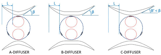 Geometrical differences between the bi-directional A, B and C diffusers adopted for the single equivalent turbine.