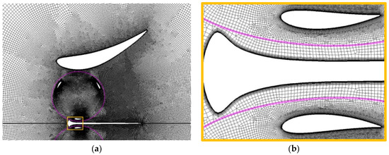 Cell distribution in the turbine region with the interface lines (highlighted in pink) between fixed and rotating grids (a); grid details around blades and the central separation wall (b).