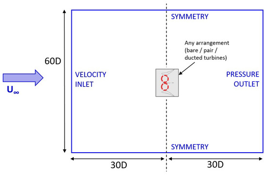 For the present investigation the turbine (or turbine pair) is located at the centre of a square domain with edge of 60D. This choice is done according to the accurate sensitivity analysis on the effects of the domain dimensions documented in [33], and is sufficient to avoid that inlet domain length or lateral boundary blockage lead to overestimate the CP due to a velocity magnitude increase in the flow approaching the turbine. Overall domain dimensions and boundary conditions are illustrated in Figure 4.