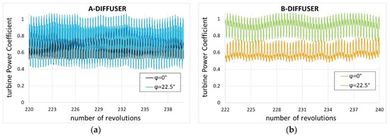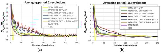 The graphs also show a dashed line indicating the value 1.05, that corresponds to a convergence criteria threshold reputed fairly conservative (and assumed, for instance, by Almohammadi et al. in [47]). On the base of these verifications, in the current study we simulate 100 rev. for bare turbines, 200 rev. in case of the hydrofoil shaped diffuser, and 240 rev. in case of the symmetrical diffuser. Moreover, a great attention is paid to individuate the averaging period that is more suitable to each of the cases, in order to avoid any oscillation of the CP results (that would inflict the comparison between different cases). According to this, the reader must remember that in the following the meaning of CP is “CP averaged on a proper number of revolutions”.