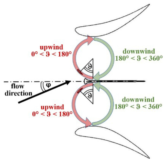 Free stream velocity and turbulence are 2.25 m/s and 5%. TSR is set to the optimal value, that is 1.7 for bare turbines [33] and, due to the flow acceleration inside the diffuser [26], 1.9 for ducted turbines (as it resulted from a preliminary investigation, not reported here for brevity). The blade angular position (ϑ) and the yaw angle of the flow (φ) are defined in Figure 6, together with an illustration of the upwind and downwind paths of the blade during one revolution. Irrespective of the (anticlockwise or clockwise) rotation sense the upwind path (0° ≤ ϑ ≤ 180°) starts with the blade chord parallel to the current, whereas the downwind path covers the range 180° ≤ ϑ ≤ 360°. The rotation verse of the turbine pair is set according to [30]. In case of yawed flow, the “first” and “second” turbines are the rotor that is first and second approached by the flow (in the figure, they correspond to the lower and to the upper rotors, respectively).