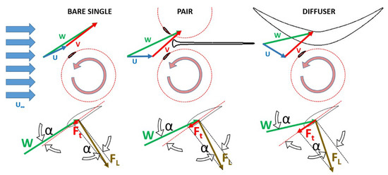 Triangles of velocities and hydrodynamic forces for the flow approaching a blade with ϑ~40° in case of a bare single turbine (left) a pair of closely spaced turbines (centre), and a turbine inside a convergent-divergent diffuser (right).