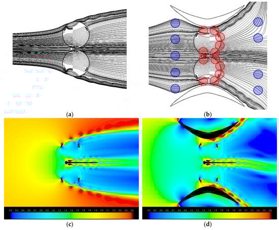 Stream tube path-lines and velocity magnitude map [m/s] for the bare rotors (a,c), and for the rotors ducted in the symmetrical diffuser (b,d). In (b) flow speeds lower and higher than in case of bare turbines are marked in blue and red, respectively.