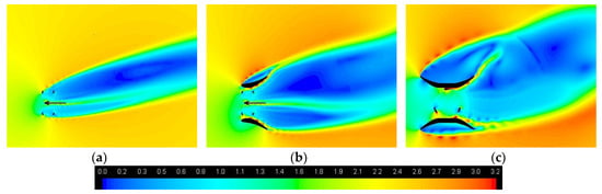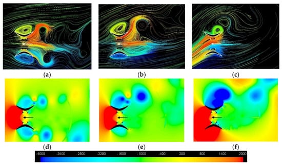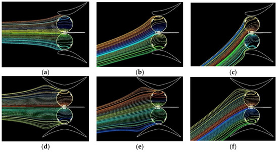 Path-lines of the incoming flow that will be elaborated by the two rotors located inside the hydrofoil shaped and the symmetrical diffusers, in case ϕ = 0° (a,d), ϕ = 15° (b,e) and ϕ = 30° (c,f).