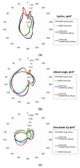 The attack angle (Figure 11b) is high in the early upwind region for all the paired configurations, including the bare turbines [33,48], yet the diffusers also allow high α in the late upwind zone, especially in case of the symmetrical one (as already observed comparing the path-lines inclination in Figure 10a,d). It can be noticed that the diffusers also produce α augmentation (in absolute value) in downwind, however this is a consequence of the U increasing that modifies the velocity triangle.