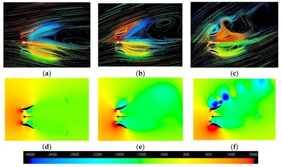 Path-lines and static pressure [Pa] for the hydrofoil shaped diffuser with ϕ = 0° (a,d), ϕ = 15° (b,e) and ϕ = 30° (c,f).