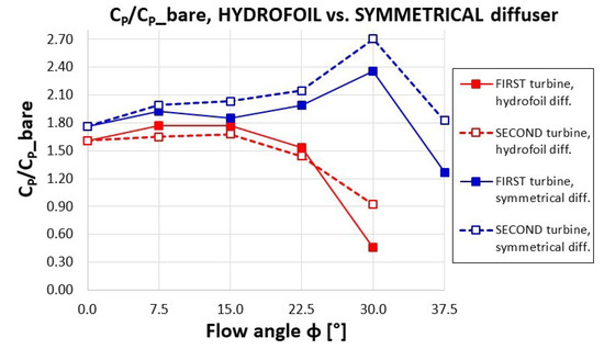 The arguments presented so far are useful to understand the results summarised in Figure 15, which shows the performance of each rotor of the pair in terms of diffuser efficiency (CP normalised by the bare turbine CP). It is seen that, at any yaw angle, the symmetrical diffuser has a performance higher than that of the original diffuser. In case of symmetrical diffuser, the performance of the second rotor overcomes that of the first rotor, and CP grows up to φ = 30° (exhibiting a drastic drop at φ = 37.5°). Whereas, for the hydrofoil shaped diffuser, the first rotor works better than the second, and CP improves up to φ = 15°, then it starts to drop. It is interesting to notice that the enhancing of the diffuser performance with φ was never found in case of ducted horizontal axis turbines, which at least exhibit a constant CP (or just a small drop) until a certain φ.