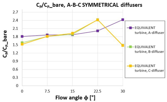 Relative CP (i.e., CP normalized by the CP of the bare turbine) for the single equivalent turbine inside the A, B and C symmetrical diffusers.