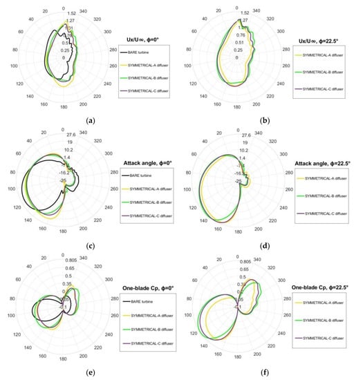 Despite the fact that for all the cases that have been investigated, the CP was higher the higher the stream tube width was measured, the diffuser accelerating capability alone cannot justify the formidable power output improving that have been calculated with CFD, especially for yawed flows. As shown by Castelli et al. [53] an effective way to asses and justify the energy performance of a straight-bladed CFT is to graphically represent the evolution of both the rotor torque (or CP(ϑ)) and blade angle of attack. Then, to deeply understand how the diffuser presence affects the key mechanisms that determine torque generation we analyse the polar diagrams of Ux(ϑ) and α(ϑ), and then the one-blade CP(ϑ) predicted during one revolution, shown in Figure 11 for φ = 0°.