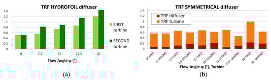 A vortex formation like the Karman vortex street is seen downstream the trailing edges of the symmetrical diffuser at φ = 0°. As the yaw angle increases, the vortex shedding becomes asymmetric: it almost expires at the upstream side of the diffuser, and conversely becomes stronger and stronger at the downstream side, entailing a very low pressure zone behind the diffuser. The vortex shedding from the original diffuser is much less important, being significant only for φ = 15° and 30°, yet the low pressure zones behind the diffuser are less extended and modest in absolute values. In our opinion, these differences in the external fluid dynamics could explain the different flow acceleration attitudes, and therefore flow rate passing through turbines, exhibited by the two diffusers. The literature on ducted turbines gives evidence of how viscous interactions between internal and external flows can be advantageously exploited to achieve a remarkable increasing of the flow concentration capability in diffusers equipped with deflectors [26] or flanges [54,55] at the exit periphery. The mechanism of flow acceleration was explained as follows [55]: a large vortex is generated behind a flange and the backpressure of the diffuser becomes lower than that of a diffuser without a flange. Therefore, the mass flow drawn into the diffuser increases and the flow speed through the turbine becomes high. Although we don’t have a flange, strong vortices at the diffuser sides occur thanks to the concave external shape of the symmetrical diffuser. These vortices boost the suction in the turbine wakes, as suggested by the rear stagnation points of the diffuser (i.e., where internal and external flows meet) that are moved forward, farther from the diffuser axis, as if virtually the aspect ratio of diffuser was enlarged. This can be realized comparing the rear stagnation point positions of Figure 12a,b.