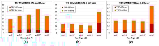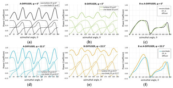 It is intuitive that A is able to direct the flow towards the blade with a better angle than B and C during early and late upwind, and this effect should work at any yaw angle (the reader can recognize it in Figure 17c for φ = 0°). However, the better CP at 22.5° followed by a remarkable drop at 30° shown by B and C in comparison to A, suggests that in those cases the main role is played by viscous effects, as it is argued comparing Ux of the three diffusers at φ = 22.5° (Figure 16). In conclusion, considering only CP the best diffuser would seem A, yet practical issues need to be counted for.