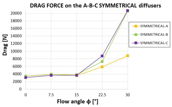It must be specified that, due to the larger size (D* = 2.15D) and therefore larger Reynolds number, the bare equivalent turbine gives a better CP by 8.0%. The effects of the diffuser geometry at different yaw angles have been investigated. This analysis is limited to symmetrical diffusers, since they are bi-directional and furthermore the symmetrical diffuser (named diffuser A in the following) that has been simulated for the double-rotor configuration provided better CP at any yaw angle. The diffuser efficiencies calculated for A (Figure 16) are similar in values and trend to those that have been found for the ducted paired configuration. Then we can conclude that the power output increasing with the yaw angle is a general characteristic of ducted CFTs, regardless of the (single or double-rotor) configuration. As mentioned, B and C have the same aspect ratio (exit section/throat section) of A, therefore in absence of viscous effects they should all accelerate the flow in the same manner. Yet, the features of the diffuser external shape entail different vortex structures and then backpressures in the rotor wakes. However it is difficult to distinguish the contribution of Ux and α (i.e., of the external and internal fluid dynamics) on CP values resumed in Figure 16.