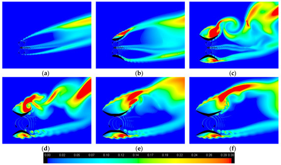 Turbulent kinetic energy, in case of ϕ = 15°, for the bare pair of turbines (a), the pair inside the hydrofoil shaped diffuser (b), the pair inside the symmetrical diffuser (c), and the equivalent single turbine inside the A, B and C diffusers (d,e,f).
