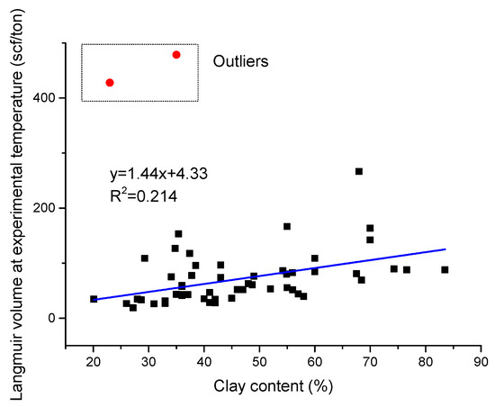 where VL is the Langmuir volume at experimental temperature, scf/ton; TOC is the total organic carbon, wt %; is the total clay content, %.