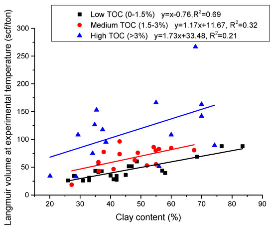 Comparing with the TOC, clay content appears to have a much less relationship with the Langmuir volume (Figure 2), demonstrating a limited contribution to the methane adsorption. However, it has been reported that the contribution of clay minerals to the methane adsorption is significant for low TOC shale samples [6,20]. To explore the effect of clay on methane adsorption in shales, the studied samples were classified into three groups of low (0–1.5%), medium (1.5–3%), and high (>3%) based on the TOC content.