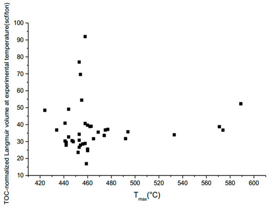There is no meaningful relationship between the TOC-normalized Langmuir volume at experimental temperature and Tmax for the studied shale samples.